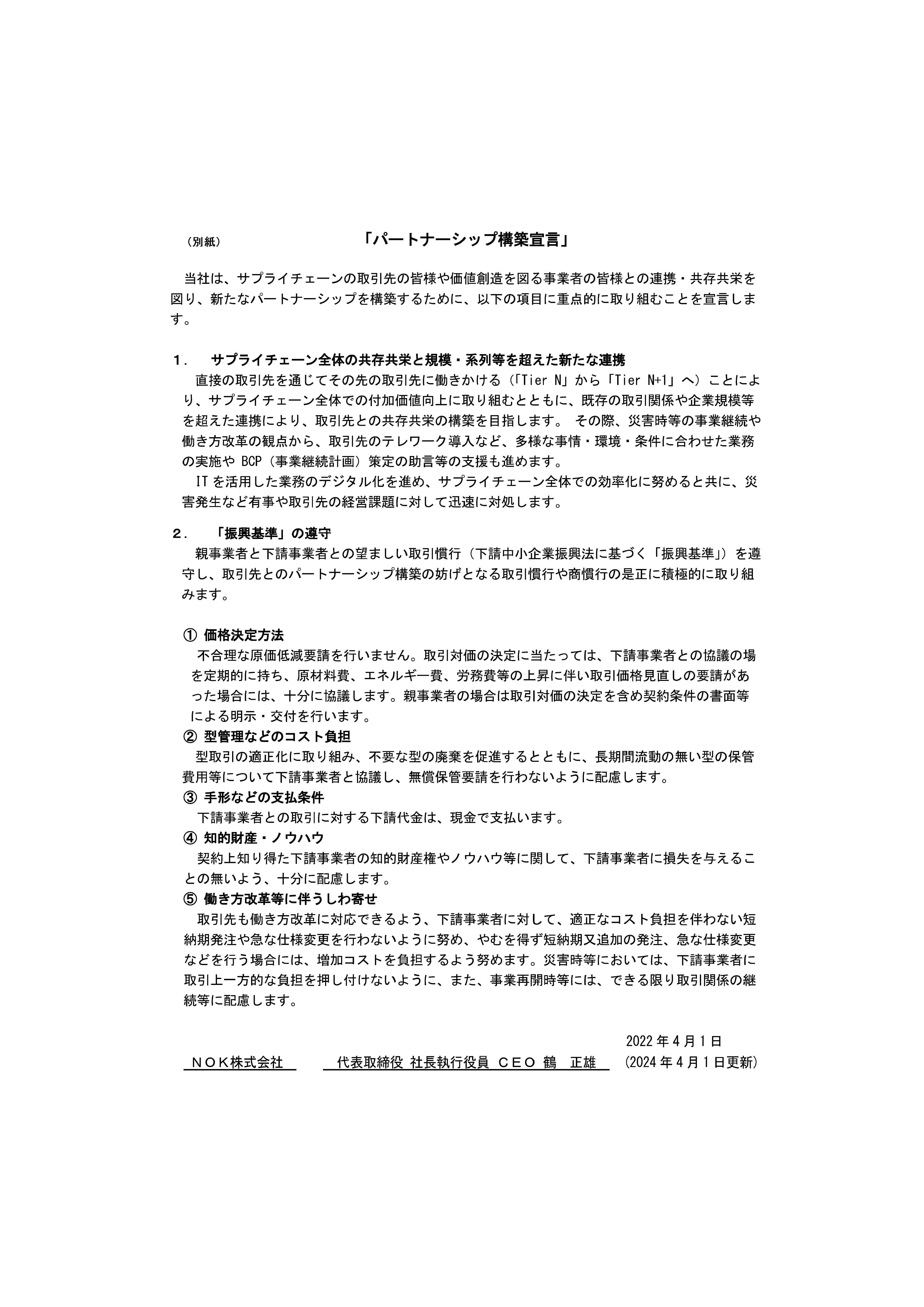 NOKは内閣府および経済産業省などによる「パートナーシップ構築宣言」に賛同し、2022年4月1日に公表しました。(別紙参照)